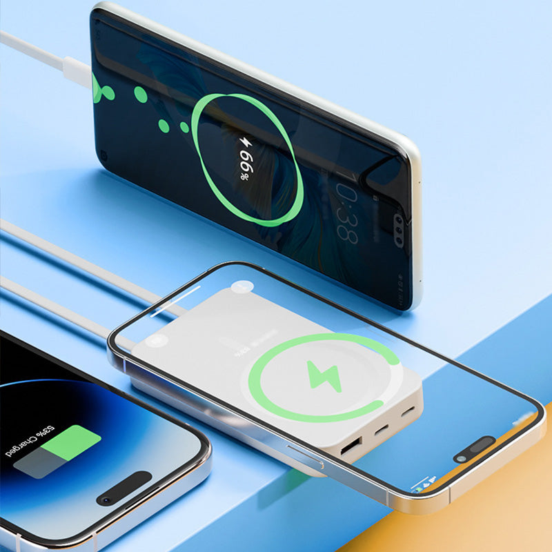 Entrée/sortie : Sortie de charge sans fil : 15 W, entrée Lightning : 18 W, entrée/sortie Type-C : 20 W, sortie USB : 22,5 W, sortie câble Type-C : 5 V 3 A, 9 V 2 A, 12 V 1,5 A, sortie câble Lightning : 18 W