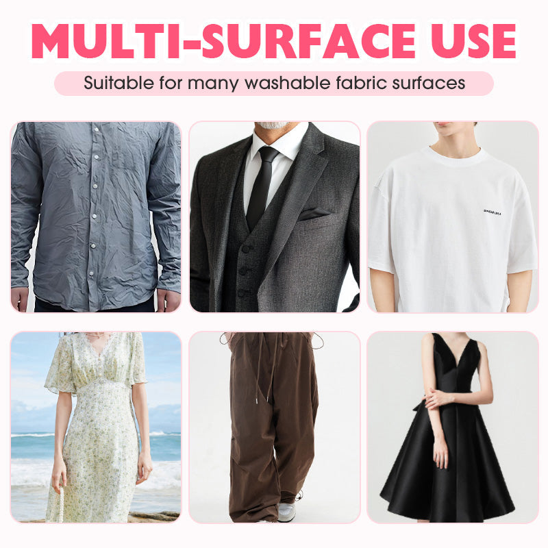 UTILISATION MULTI-SURFACE- Convient aux surfaces en tissu lavable telles que les costumes, les uniformes et les robes. La formule multifonctionnelle aide également à réduire l'adhérence statique sur les fibres synthétiques.