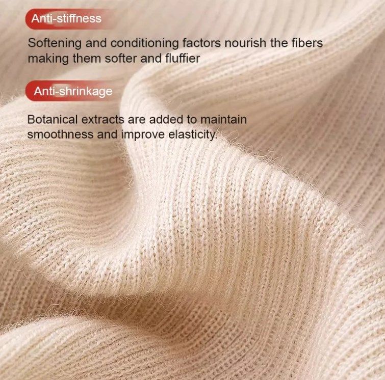 RÉTABLISSEMENT DU MOUSSEUX: La formule améliore le moelleux et la douceur des fibres de laine, garantissant que vos pulls retrouvent leur confort et leur aspect luxueux.