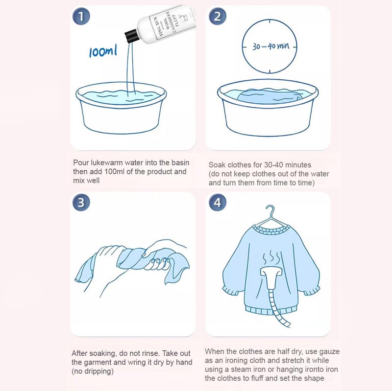 RÉTABLISSEMENT DU RÉTRÉCISSEMENT: Cet agent détend et étire efficacement les fibres des pulls en laine rétrécis, vous permettant ainsi de retrouver la taille et la coupe d'origine de vos vêtements.